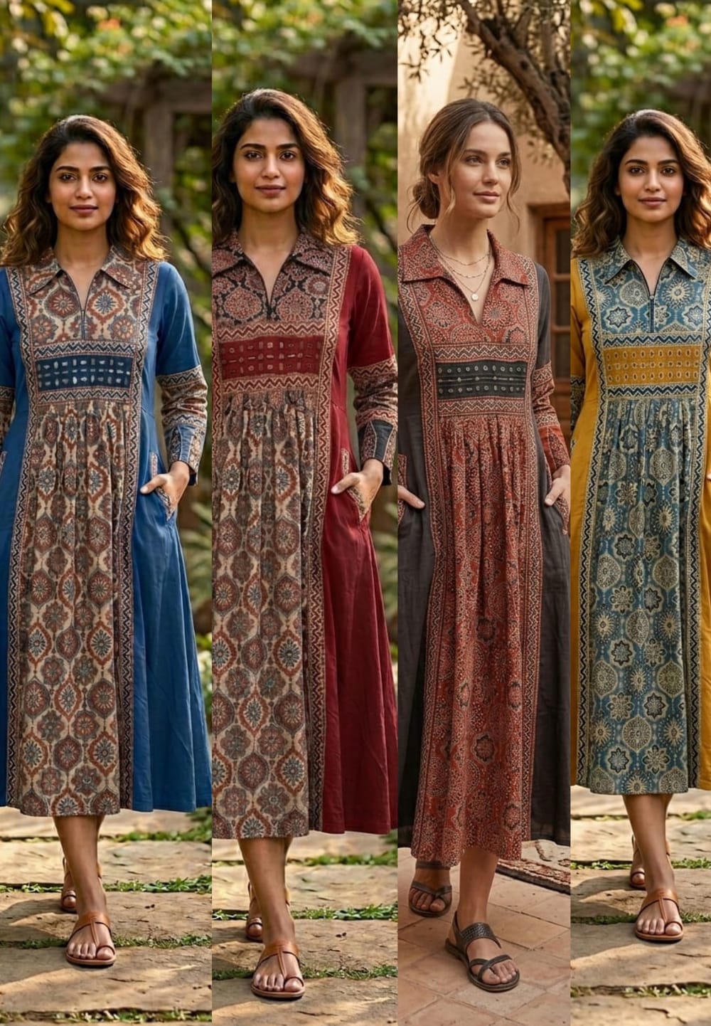 Handloom cotton Ajrakh print smart one piece dress length 47 inch (B225)