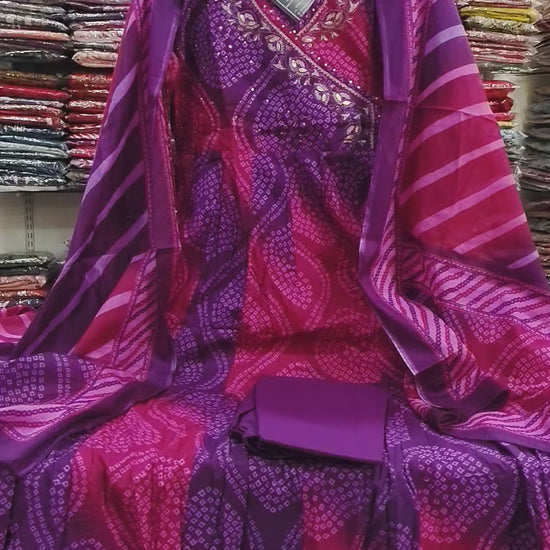 Purple with pink Angrakha pattern pure cotton three piece set (A1079)