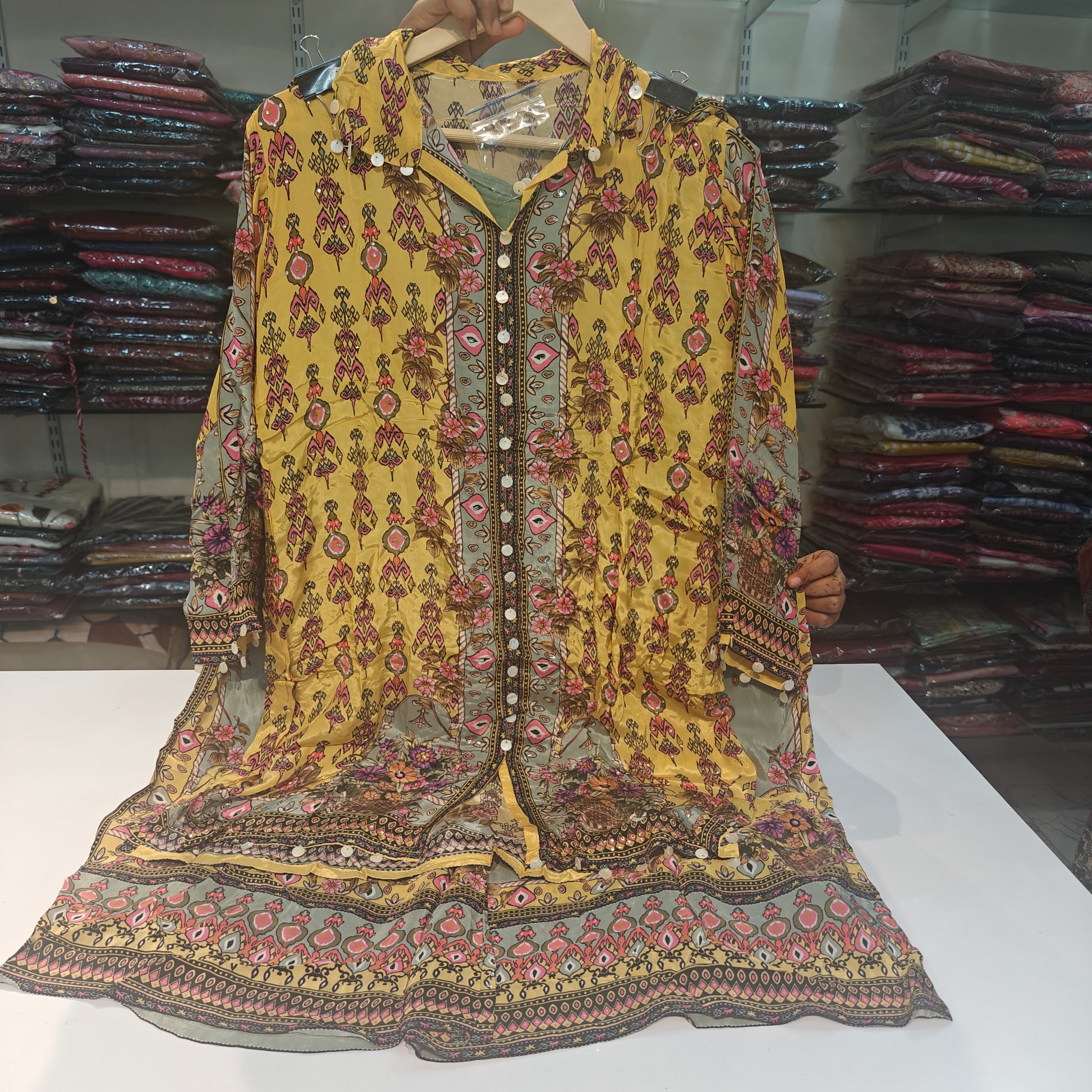 Lime yellow with sea green pure crape silk two piece cordset (A593)
