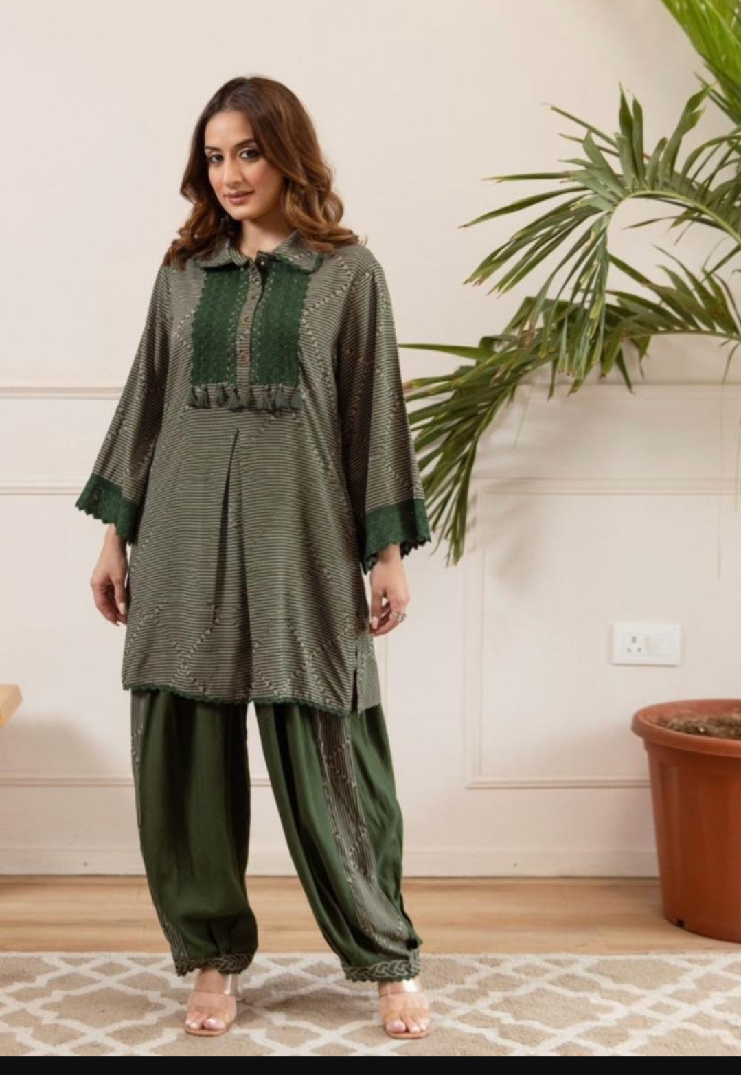 Green cotton modal with farshi salwar two piece cordset (A756)