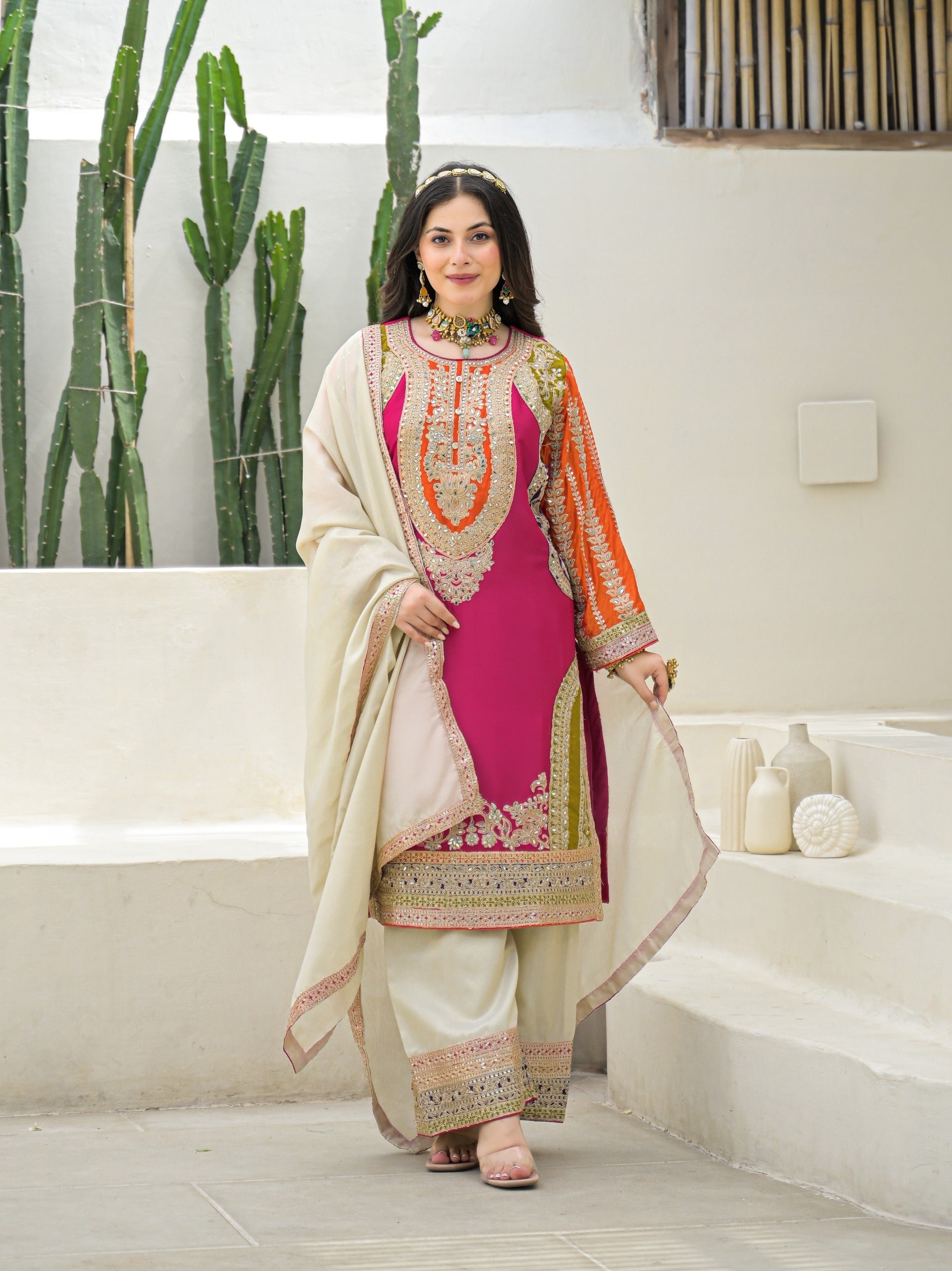 Pure chinnon full work pink based three piece set (A931)