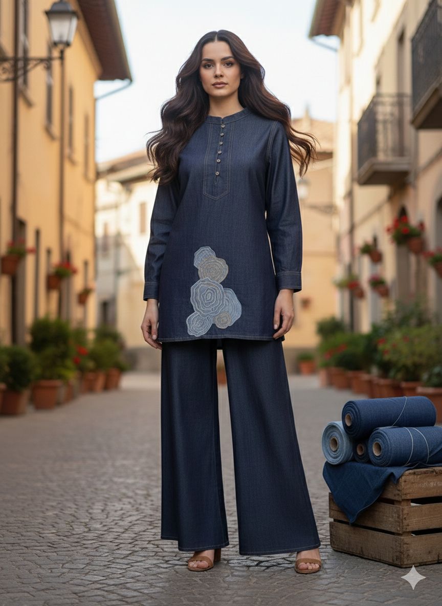 Soft denim with thread applique work smart two piece cordset (A1522)